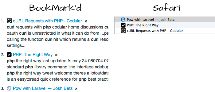 We can see that BookMark’d returns a result on how to write a cURL request with PHP at the top. Safari returns Pow with Larvel and PHP The Right Way before that. If you look at these documents, they do contain the terms php and curl, but they’re for installation scripts, and not what the document really means. Of course, BookMark’d returns all documents that contain those terms, but it tries to return them by meaning, as we add more features, hopefully we can narrow down the results.
