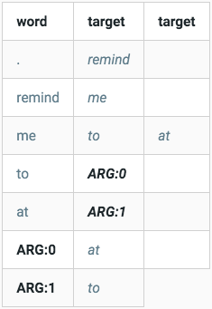 so when we traverse a new sentence, if we see the word “to”, we know that the next word probably goes into ARG:0, and the words stay there until the end of the string, or until we reach a “at”. remind me to eat pizza at lunch, if we follow our table would place eat pizza in ARG:0, and lunch in ARG:1.